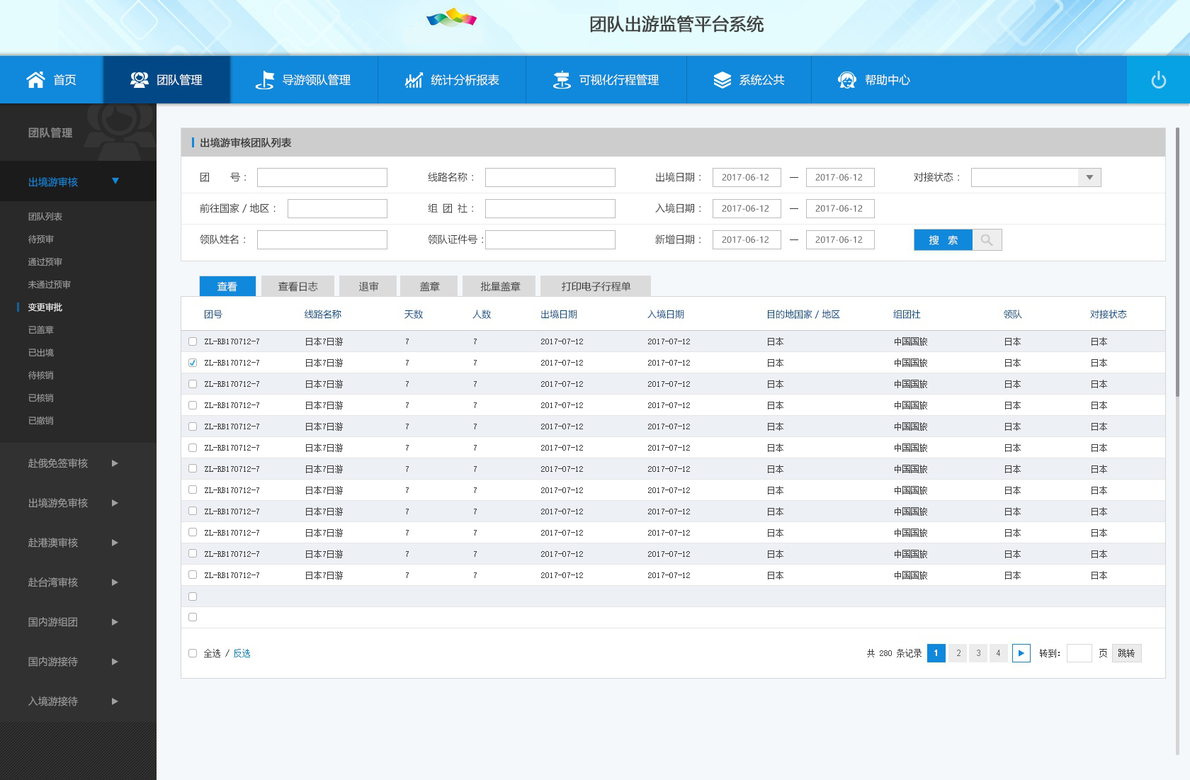 1)  團隊管理:出境游審核、赴俄免簽審核、出境游免簽審核、赴港澳審核、赴臺灣審核、國內(nèi)游組團、國內(nèi)游接待、入境游接待。