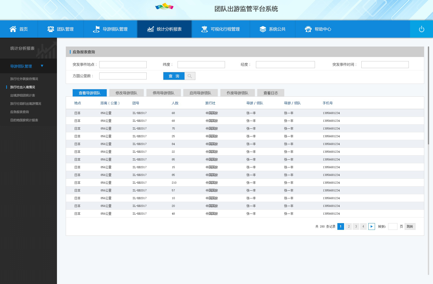 隨著出境旅游門檻越來越低,出境游熱度持續(xù)升溫,對出境旅游團隊進行有效管控就顯得至關(guān)重要,出境旅游團隊監(jiān)測與分析系統(tǒng)對接國家旅游團隊管理系統(tǒng)數(shù)據(jù),通過對旅游團電子行程單和旅游合同數(shù)據(jù)的接入,實現(xiàn)對出境旅游團隊監(jiān)測,方便在發(fā)生旅游突發(fā)事件時迅速開展救援、服務(wù)工作。