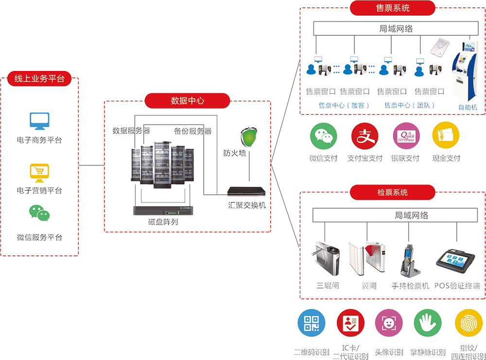包含線下電子票務(wù)系統(tǒng),線上分銷平臺、電子商務(wù)平臺、微信服務(wù)平臺等,通過線上業(yè)務(wù)系統(tǒng)進(jìn)行產(chǎn)品預(yù)訂,數(shù)據(jù)同步匯總至數(shù)據(jù)中心,線下系統(tǒng)進(jìn)行取票、驗證,實現(xiàn)了線上、線下一體化的功能,售票支持微信、支付寶、銀聯(lián)、現(xiàn)金等支付模式,驗票支持二維碼、IC卡/二代證、頭像識別、掌靜脈、四連指等識別模塊,功能結(jié)構(gòu)圖如下: