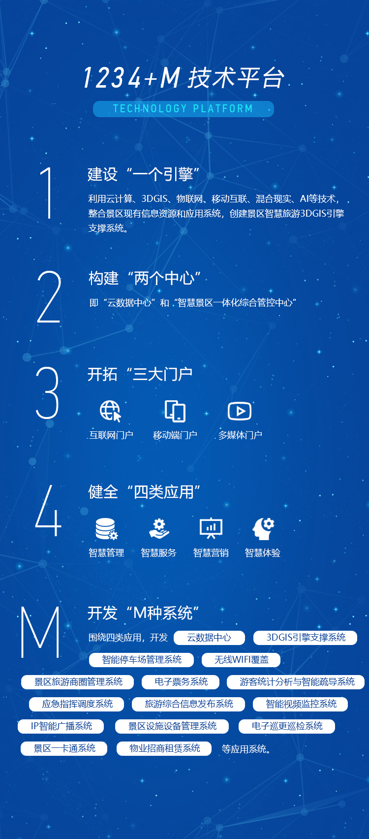 云野科技結合多年智慧景區建設經驗及自身研發的成熟產品,緊緊圍繞“智慧管理、智慧服務、智慧營銷與智慧體驗”四類應用,通過“1234+M”技術平臺的實施,實現景區智慧旅游建設目標。