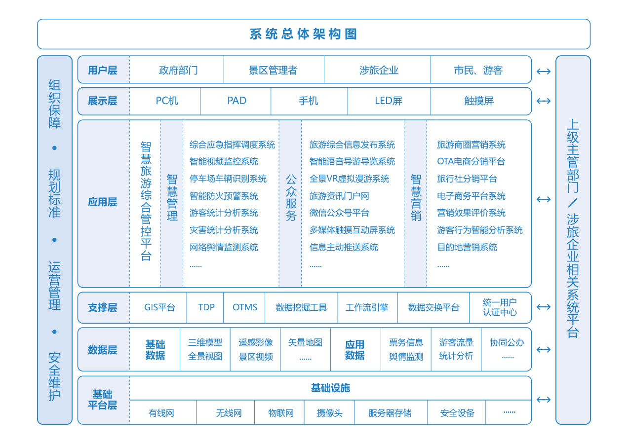 以云數據中心平臺為基礎,以地理信息GIS平臺為支撐,以組織保障、標準規范、運維管理與安全保障為后盾,從綜合管理、游客服務與旅游營銷三大層面入手,采用互聯共享、融合提升和科學管理的先進設計理念,逐步建立起特色鮮明、運轉高效的智慧旅游管理體系、服務體系和營銷體系。