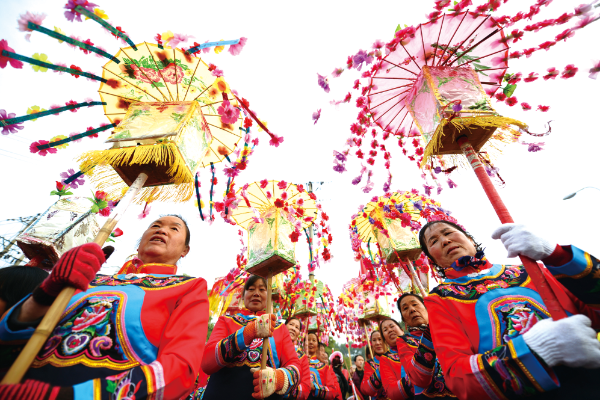 △ 2018年3月2日,幾位靚麗的女孩子在廣場上表演擊鼓。當日是中國傳統(tǒng)節(jié)日元宵節(jié),數(shù)萬民眾來到西安大唐西市,熱鬧逛廟會、欣賞民俗表演。張遠攝