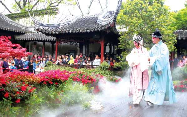 △ 2018年4月5日,2018“留園尋夢”吳文化特色游活動在蘇州古典園林留園啟動,昆曲、評彈、古琴等地方特色表演,向中外游客展現(xiàn)地方風情。王建康攝