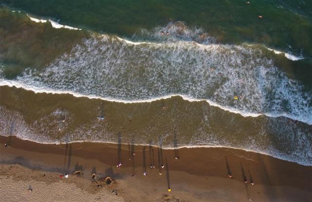 游客在海南省三亞市海棠灣海灘上游玩(4月13日無人機拍攝)。新華社記者 賀燦鈴 攝