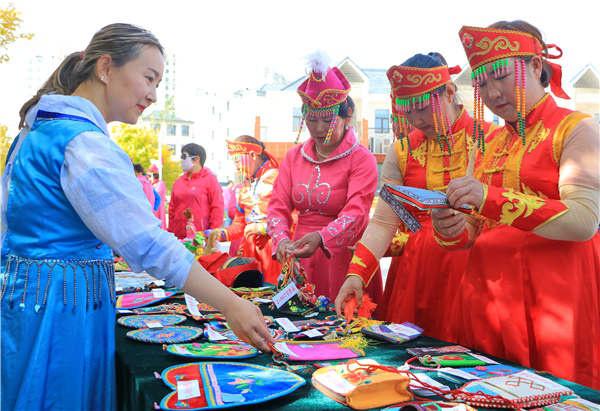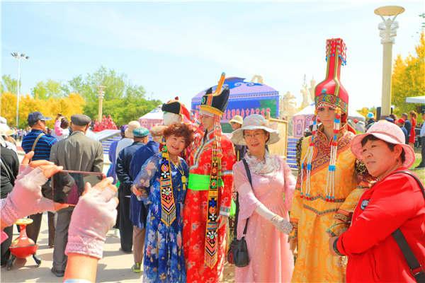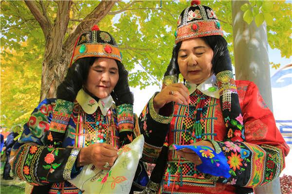 華麗的民族服飾,既能欣賞又能體驗,令在場游客們紛紛對博湖刺繡藝術之美夸贊不已,一些觀眾還興致勃勃地試穿刺繡蒙古族袍,用相機、手機定格下美好的瞬間。
