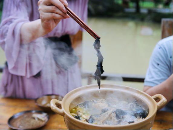 巖耳洗凈,單獨(dú)成盤。待雞湯沸騰,咕嚕咕嚕冒出熱氣,這時(shí),夾起一塊巖耳,放進(jìn)湯里,七上八下涮一下,即可享用,感受入口那一刻的鮮、嫩、滑、脆。