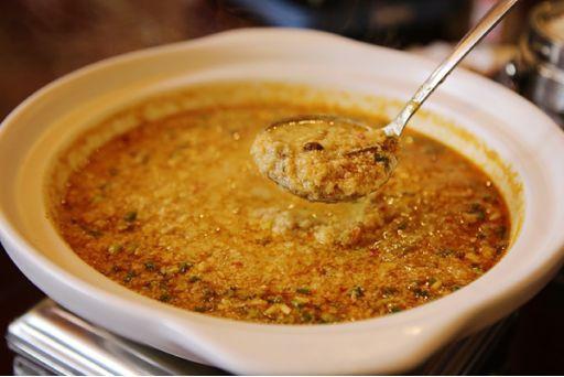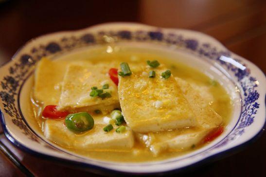 雖是家常菜式,“山溝溝”卻做得精致地道。泉水充分泡發(fā)黃豆,放進(jìn)石磨,現(xiàn)磨出漿,再濾渣,點(diǎn)鹵。豆腐的燒法也不復(fù)雜,薄片雙面煎黃,再拿濃湯一煨,出鍋撒點(diǎn)蔥花點(diǎn)色,調(diào)味料擱得極少,最大程度上保證了泉水豆腐的鮮甜。