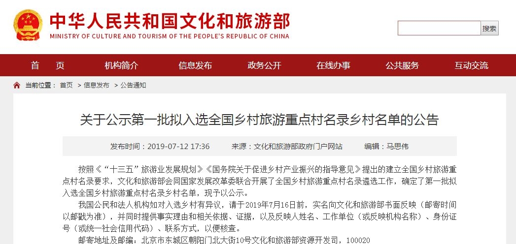 我國公民和法人機構如對入選鄉村有異議,請于2019年7月16日前,實名向文化和旅游部書面反映(郵寄時間以郵戳為準),并同時提供事實理由和相關依據、證據,以及反映人姓名、工作單位(或反映機構名稱)、身份證號(或統一社會信用代碼)、聯系方式,以便核查。