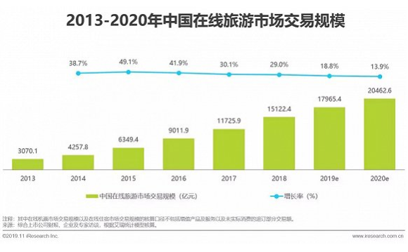 2018年中國在線旅游市場交易規(guī)模為15122.4億元,較2017年增長了29.0%。下沉市場用戶基數(shù)較大,旅游產(chǎn)品的平均客單價(jià)格較高,大部分低線級城市游客更傾向于通過線下渠道購買旅游產(chǎn)品,中國在線旅游市場仍有較大增長空間。