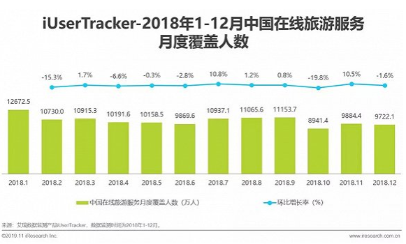 艾瑞監(jiān)測數(shù)據(jù)顯示,2018年中國在線旅游行業(yè)PC端月度覆蓋人數(shù)波動仍呈淡旺季分布。其中,1月為全年峰值,近1.3億人,其后回落至6月的約1億人,7-9月維持平穩(wěn),約為1.1億人。艾瑞分析認(rèn)為,由于用戶基數(shù)較穩(wěn)定,PC端流量全年波動幅度較小,呈現(xiàn)平穩(wěn)態(tài)勢。