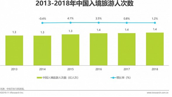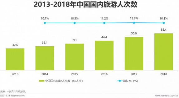 根據(jù)文旅部數(shù)據(jù),2013-2018年,在中國國內(nèi)旅游市場中,國內(nèi)旅游人次數(shù)呈現(xiàn)明顯增長態(tài)勢,且多年增速維持在10%以上;在入境旅游市場中,每年入境旅游人次數(shù)保持平穩(wěn),增幅不大;在出境旅游市場中,出境旅游人次數(shù)在2016年由于受到政治和疫情的影響而增速略有下滑,此后維持穩(wěn)定增長態(tài)勢。