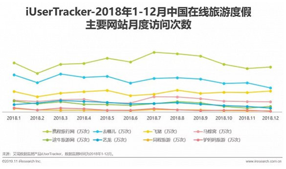 根據(jù)艾瑞監(jiān)測數(shù)據(jù),2018年中國在線旅游度假主要網(wǎng)站中,攜程與去哪兒的網(wǎng)站月度訪問次數(shù)相差較小,途牛等玩家的用戶流量在全年基本保持平穩(wěn)。