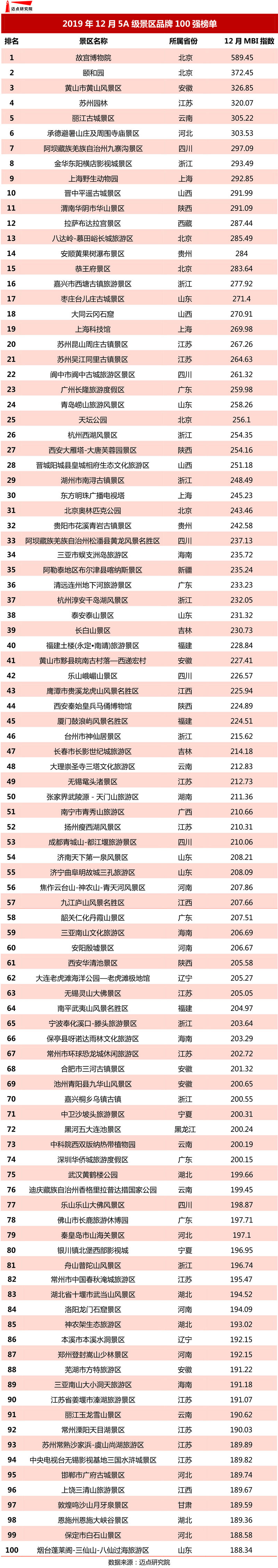 下是邁點研究院獨家發布的“2019年12月5A級景區品牌100強榜單”。月度5A級景區品牌百強榜單由邁點研究院研制,旨在通過數據解讀景區在互聯網及移動互聯網領域的影響力,為景區制定戰略方案提升品牌發展賦能。