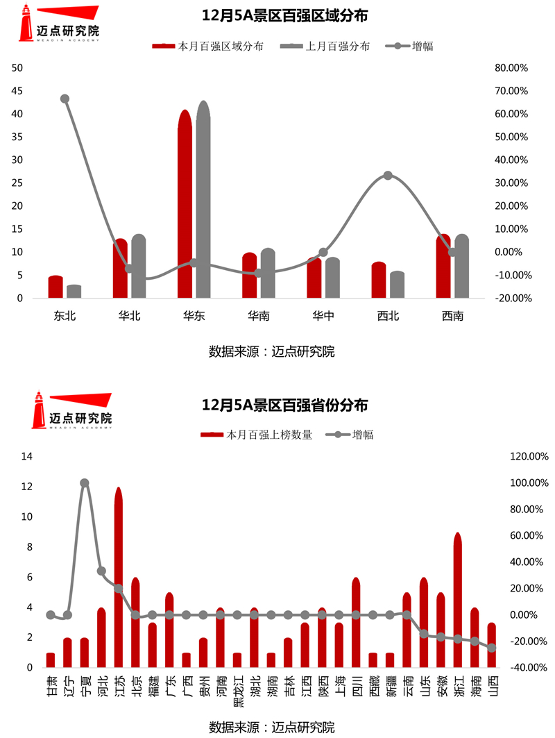 環比上月,本月華北、華東及華南地區市場熱度減退,但東北和西北地區上榜景區數量呈現出大幅上漲態勢,其中東北增幅最為顯著,環比上升66.67%。相較于其他省份,本月 遼寧甘肅表現突出,區域內百強景區從無到有,實現跨越式增長。東北地區生態環境優越,森林、草原、濕地、冰雪旅游資源獨具特色,在12月數據監測中,該地區共有5家景區進入百強名單,其中本溪市本溪水洞景區和大連老虎灘海洋公園作為百強新秀成功入圍。西北地區本月表現尤為亮眼,甘肅敦煌鳴沙山月牙泉景區繼8月份后再度晉級百強。