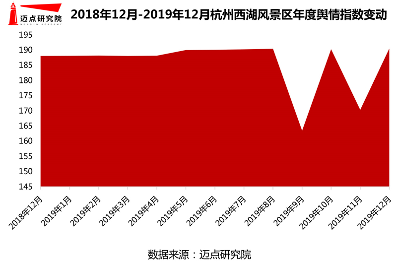 在反映實際客群關注度方面的輿情指數上,本月表現突出的是杭州西湖風景區。經邁點研究院數據監測,12月杭州西湖輿情指數高達190.49,環比增長11.81%。從全年該景區輿情指數變動來看,除9月及11月呈現小幅度下降之外,整體處于穩步發展態勢。