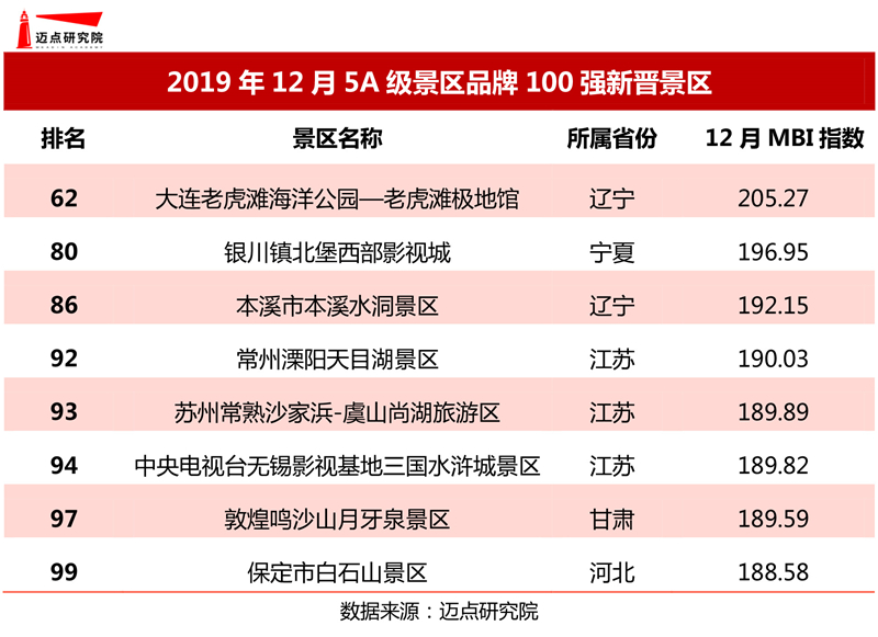 “2019年12月5A級景區品牌100強榜單”數據來源于邁點品牌指數MBI,根據12月邁點品牌指數MBI的258個5A景區數據匯總統計而成。具體說明如下: