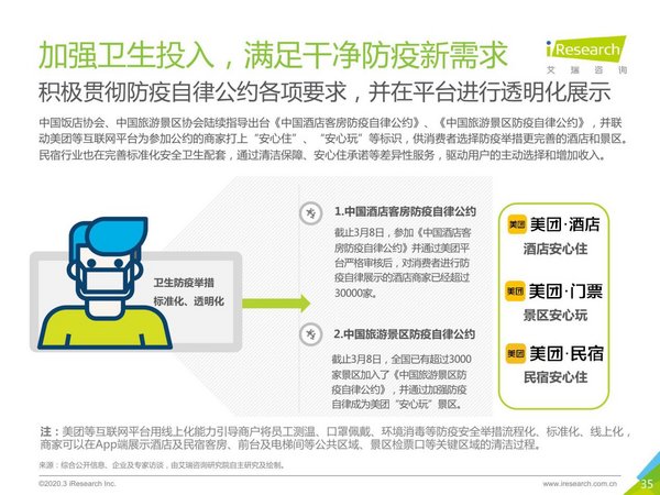 與此同時,中國酒店旅游業的高在線化率也讓產業鏈各方的協同效率大增。據艾瑞觀察,在行業協會及OTA的共同推動下,行業各方聯合主動變革。譬如,中國飯店協會、全國綠色飯店工作委員會、美團聯合發布《中國酒店客房防疫自律公約》;中國旅游景區協會指導下,美團及多家景區聯合發布《中國旅游景區防疫自律公約》,帶動了參與酒店、景區的衛生服務標準化、衛生防疫信息線上化,滿足了用戶的安全需求。