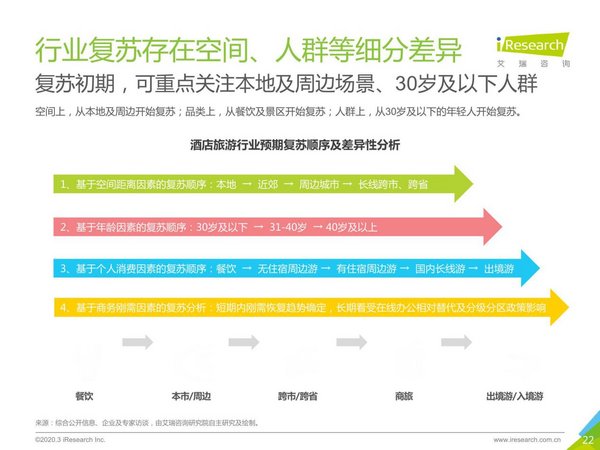 隨著國內疫情形勢的好轉,因疫情而受到壓制的消費信心也逐漸恢復。根據艾瑞的用戶研究,餐飲需求或率先回暖,商務出差、國內游、出境游逐級恢復。