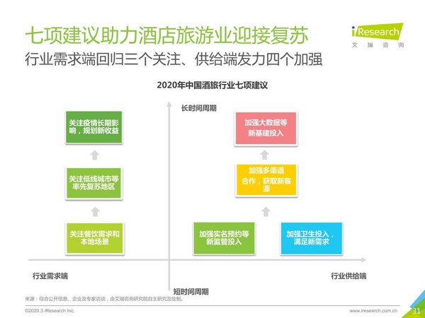 最后,艾瑞為酒店旅游業提出迎接復蘇的七項建議。其中,需求側需要做到“三個關注”,分別為:關注疫情影響的長期性,主動規劃新收益來源;關注低線城市等率先恢復的腹地市場,分城定策,部分縣市區有望率先回暖;關注提前復蘇的餐飲需求和本地場景,挖掘自身的餐飲板塊、本地客源的收入潛力。