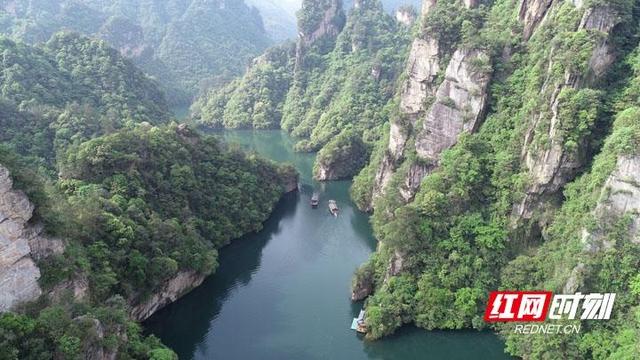 游客乘船在武陵源寶峰湖游覽。(吳勇兵 攝)