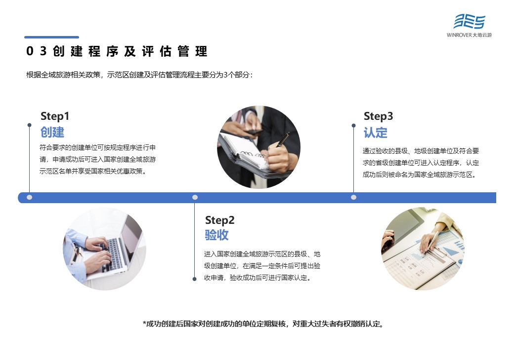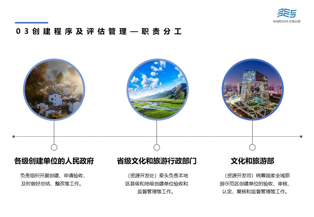 根據(jù)全域旅游相關政策,示范區(qū)創(chuàng)建及評估管理流程主要分為3個部分:即創(chuàng)建——驗收——認定。各級創(chuàng)建單位的人民政府,負責組織開展創(chuàng)建、申請驗收,及時做好總結、整改等工作;省級文化和旅游行政部門牽頭負責本地區(qū)縣級和地級創(chuàng)建單位驗收和監(jiān)督管理等工作;文化和旅游部統(tǒng)籌國家全域旅游示范區(qū)創(chuàng)建單位的驗收、審核、認定、復核和監(jiān)督管理等工作。