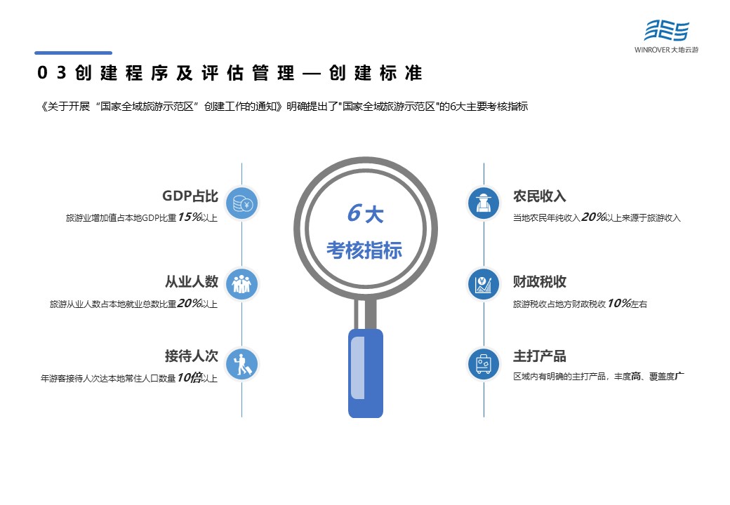 根據(jù)規(guī)定,各地首批申報,原則上不超過10%左右的縣(含縣級市),有條件省份可適當申報市(地州)為創(chuàng)建對象。創(chuàng)建主體為縣、市地州人民政府。《關于開展“國家全域旅游示范區(qū)”創(chuàng)建工作的通知》明確提出了“國家全域旅游示范區(qū)”的6大主要考核指標包括:GDP占比、從業(yè)人數(shù)、接待人次、農(nóng)民收入、財政稅收以及主打產(chǎn)品。