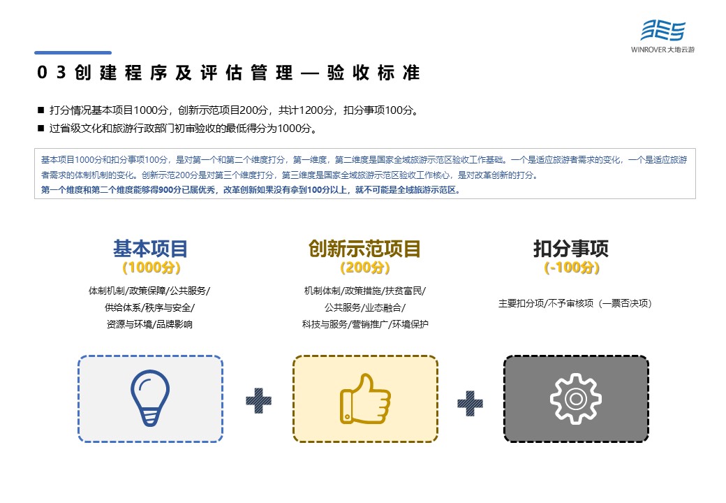 驗收標準打分包含基本項目1000分,創(chuàng)新示范項目200分,以及扣分事項100分。其中,基本項目與扣分事項是國家全域旅游示范區(qū)驗收工作基礎。一個是適應旅游者需求的變化,一個是適應旅游者需求的體制機制的變化。而創(chuàng)新示范項目是國家全域旅游示范區(qū)驗收工作核心,是對改革創(chuàng)新的打分。基本項目與扣分事項能夠得900分已屬優(yōu)秀,改革創(chuàng)新如果沒有拿到100分以上,就不可能是全域旅游示范區(qū)。