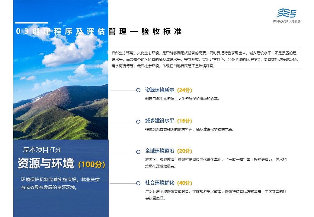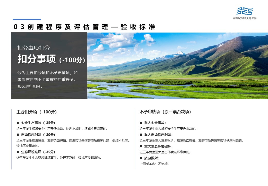 審核通過的國家全域旅游示范區(qū)縣級創(chuàng)建單位、地級創(chuàng)建單位所轄區(qū)縣和直轄市所轄區(qū)縣創(chuàng)建單位,由省級文化和旅游部制定驗收實施方案,包括暗訪、明查、會議審核三種方式。根據(jù)驗收得分結果確定申請認定的創(chuàng)建單位,并形成初審驗收報告。