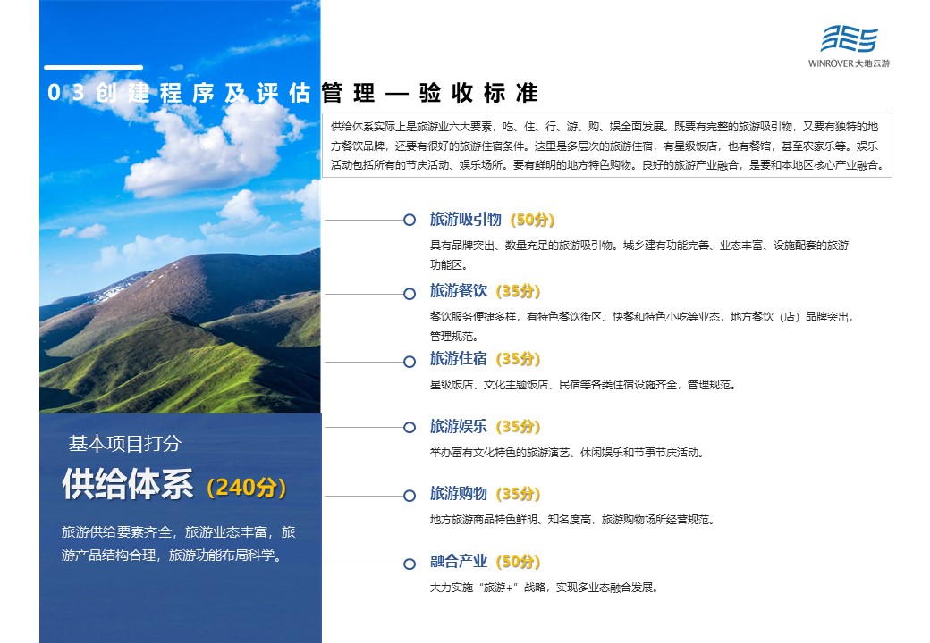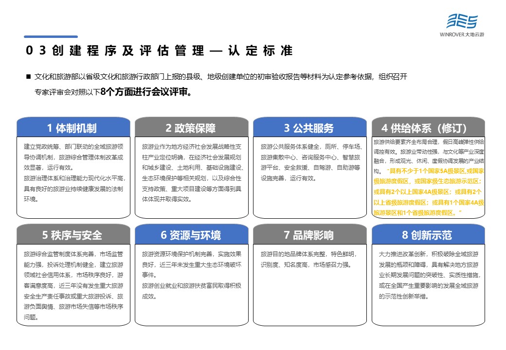 文化和旅游部以省級文化和旅游行政部門上報的縣級、地級創(chuàng)建單位的初審驗收報告等材料為認定參考依據(jù),組織召開專家評審會對體制機制、政策保障、公共服務、供給體系、秩序與安全、資源與環(huán)境、品牌影響以及創(chuàng)新示范等8個方面進行會議評審。根據(jù)最新修訂結果,認定標準在供給體系方面進行了適當“放寬”,將“具有不少于1個國家5A級旅游景區(qū),或國家級旅游度假區(qū),或國家級生態(tài)旅游示范區(qū);或具有2個以上國家4A級旅游景區(qū)”修改為“具有不少于1個國家5A級景區(qū),或國家級旅游度假區(qū),或國家級生態(tài)旅游示范區(qū);或具有2個以上國家4A級景區(qū);或具有2個以上省級旅游度假區(qū);或具有1個國家4A級旅游景區(qū)和1個省級旅游度假區(qū)。”