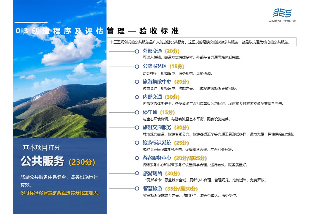 其中,基本打分項目主要由機制體制(90分)、政策保障(140分)、公共服務(230分)、供給體系(240分)、秩序與安全(240分)、資源與環(huán)境(100分)、品牌影響(60分)等7大項構成。根據(jù)最新修訂結果,將公共服務中游客服務中心的25分,降為20分,同時加大智慧旅游分數(shù)占比,將原本的30分,提升為35分。