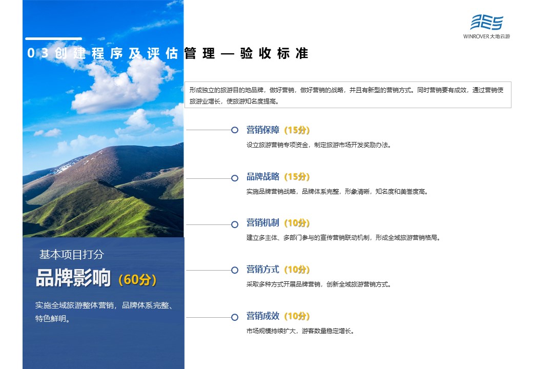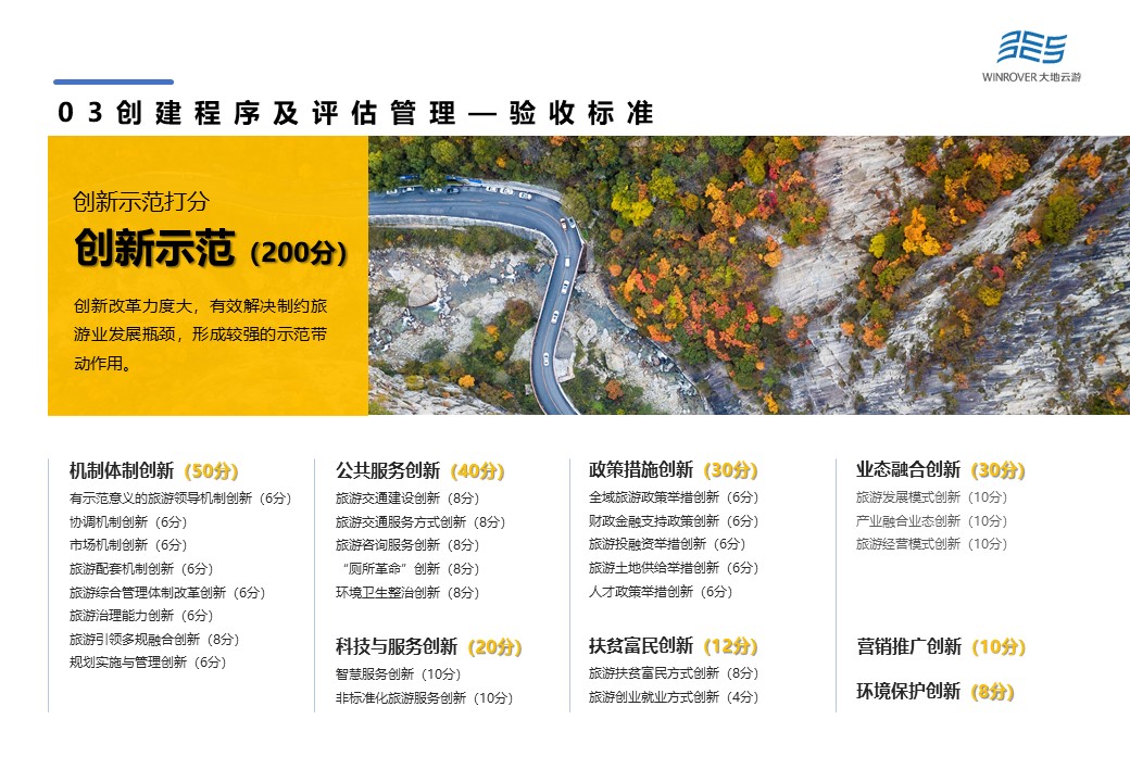 創(chuàng)新示范項目由機制體制創(chuàng)新(50分)、公共服務創(chuàng)新(40分)、科技與服務創(chuàng)新(20分)、政策措施創(chuàng)新(30分)、扶貧富民創(chuàng)新(12分)、業(yè)態(tài)融合創(chuàng)新(30分)、營銷推廣創(chuàng)新(10分)以及環(huán)境保護創(chuàng)新(8分)等8項構成。創(chuàng)新改革力度大,有效解決制約旅游業(yè)發(fā)展瓶頸,形成較強的示范帶動作用,是驗收得分的重點。