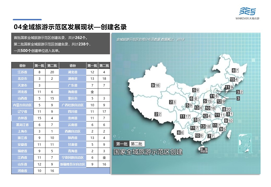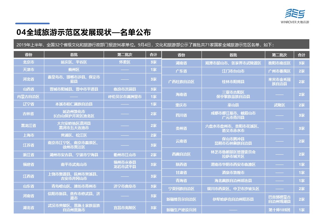 2019年上半年,全國32個省級文化和旅游行政部門報送96家單位。9月4日,文化和旅游部公示了首批共71家國家全域旅游示范區(qū)名單,大陸32個省市自治區(qū)均有1-3家全域旅游示范區(qū)。