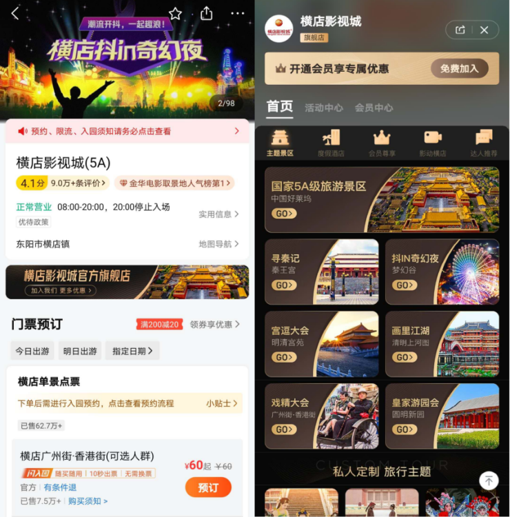 同時,結(jié)合橫店影視IP,橫店影視城會員旗艦店還為不同的會員群體量身定制了游橫店的主題旅行項目,如朋友閨蜜游、劇中人物體驗游、情侶浪漫游、暖心父母游、家庭親子度假游等。追星達(dá)人還可以搶購爆款橫店劇組見面會門票,來場影視追劇游。在橫店影視城會員旗艦店里,將圍繞其“影視基因”結(jié)合影視主題酒店、經(jīng)典景區(qū)和特色美食,傳達(dá)橫店影視城玩在電影里、住在電影里、吃在電影里、購在電影里的“影視體驗度假區(qū)”品牌形象。