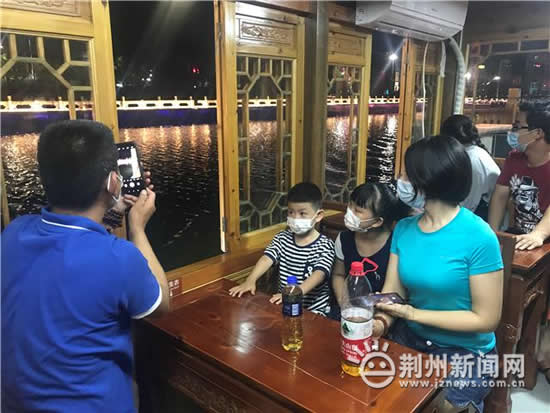 夜幕降臨,華燈初上,荊州古城賓陽樓披上五彩斑斕的“輕紗”,盡顯燈影交織下的絢麗多姿,古老的城墻散發(fā)出時尚耀眼的光芒。護(hù)城河畔,金鳳騰飛,燈火閃爍、游人如織,一步一景,人文氣息濃厚。一艘艘仿古畫舫穿梭在波光粼粼的護(hù)城河上,游客們乘船夜游,在習(xí)習(xí)涼風(fēng)中感受著夜色下如詩如畫、美不勝收的古城夜景。來自武漢的游客楊榮一家四口趁著夜晚些許清涼出來游玩,感受和白天不一樣荊州古城。
