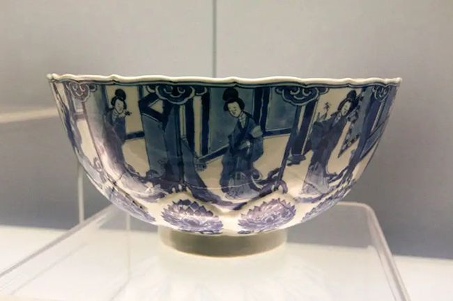 這件館藏于江西省博物館的清乾隆時期的青花仕女盤,是典型的外銷瓷款。盤內口沿及腹壁繪以帶狀花卉紋,盤心開光內繪有一位仕女。這位仕女有些與眾不同——她有著一頭濃密的卷發,身著束腰洋裝,盡顯異域風情。