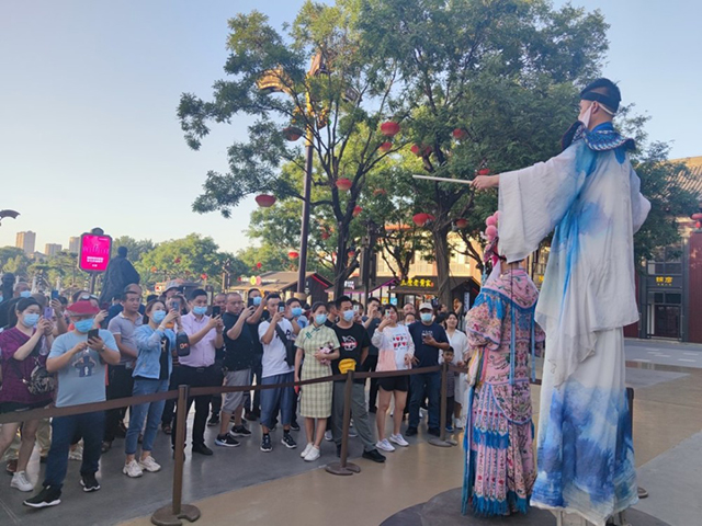 五光十色,夜夜生輝。伴隨著夜幕降臨,西安大唐不夜城迎來了一天中最熱鬧的時刻,燈光、演出、美食、文創,叫好聲、歡呼聲,游客流連忘返在不夜城,也“叫醒”了夜經濟。作為首批全國示范步行街之一,大唐不夜城用心打造夜景,從石頭人和扮演兵馬俑的網紅,到分布其中的文創店、非遺展位,體現出西安的文化特征,傳播著古城的文化魅力。