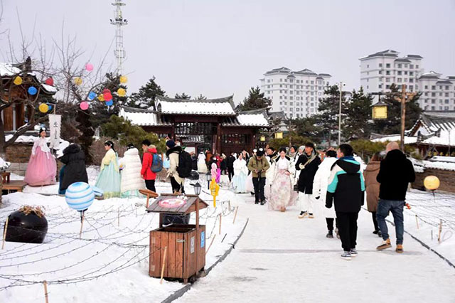 每天,位于延吉市的中國朝鮮民俗園一開門就熱鬧起來,欣賞青瓦飛檐的朝鮮族建筑、體驗制作朝鮮族美食……各個朝鮮族服裝店外排滿了來自四面八方的游客,等著穿上朝鮮族服飾拍照留念。其中一家店鋪的負責人介紹,春節期間,來店里租衣服、拍照打卡的游客特別多,每天不到8點店外就排起了長隊,平均每天都能接待三四百人。