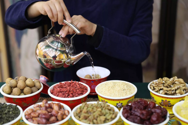 在早茶店不遠(yuǎn)處,是一家名為“劉三朵”的八寶茶店。將玫瑰、芝麻、枸杞等八種食材按個(gè)人喜好抓到蓋碗里,再倒上沸水沖泡,燜一會(huì)兒,就是一碗香甜可口的八寶茶。茶喝到剩1/3時(shí),再繼續(xù)加水慢品,直到茶湯變淡,過(guò)程頗為考究。吳忠八寶茶過(guò)去多次在國(guó)際性的博覽會(huì)上展出,受到不少外國(guó)友人的歡迎。