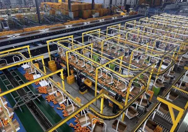 智能分選設(shè)備和成箱柑橘占據(jù)了廠房大部分空間,一列列橘色“小球”在數(shù)百米傳送帶上有序滾動(dòng)、跳躍,最終被分流至精包線,由工人進(jìn)行核檢包裝。這里是湖南省規(guī)模最大的果品智能化加工基地,每月可加工處理橘橙約1.2萬(wàn)噸。