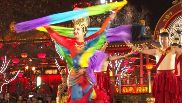 春節期間,走進西安大唐不夜城、長安十二時辰街區、西安城墻景區、漢長安城未央宮遺址公園、大明宮遺址公園等景區,不時可見《于闐樂舞》正在上演,該演出作為新疆和田縣“文旅+演藝”對外輸出的代表,讓西安的市民游客感受到絲路文化的獨特魅力。