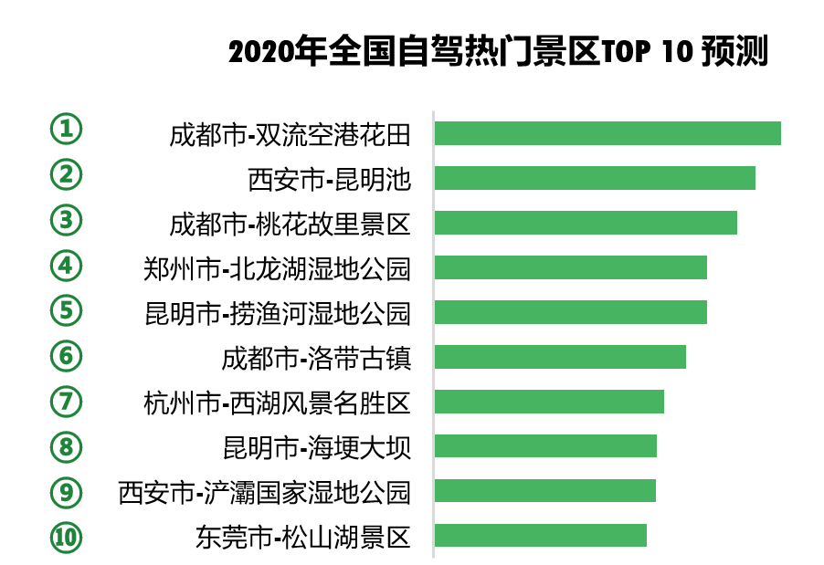 清明假期期間,從自駕出行方面來看,市民更熱衷于公園、湖邊等戶外區域,熱門景區Top10中,成都占3席,西安、昆明各占2席,成都雙流空港花田排名第一。