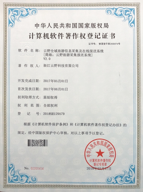 《云野全域旅游信息采集及在線報送系統V2.0》于2018年2月27日被正式授予《中華人民共和國國家版權局計算機軟件著作權登記證書》,登記號為2018SR129579。