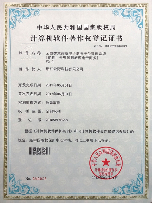 《云野智慧旅游電子商務平臺管理系統V2.0》于2018年3月21日被正式授予《中華人民共和國國家版權局計算機軟件著作權登記證書》,登記號為2018SR188299。