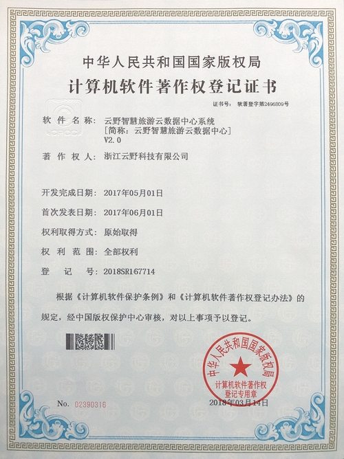 《云野智慧旅游云數據中心系統V2.0》于2018年3月14日被正式授予《中華人民共和國國家版權局計算機軟件著作權登記證書》,登記號為2018SR167714。