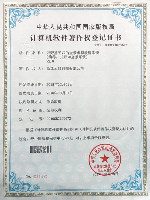 《云野基于VR的全景虛擬漫游系統V2.0》于2019年4月19日被正式授予《中華人民共和國國家版權局計算機軟件著作權登記證書》,登記號為2019SR355672。