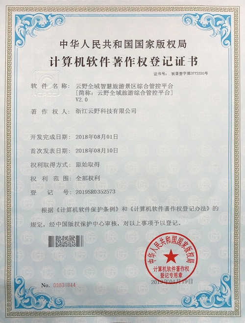 《云野全域智慧旅游綜合集成管理服務平臺V2.0》于2019年4月19日被正式授予《中華人民共和國國家版權局計算機軟件著作權登記證書》,登記號為2019SR0352516。