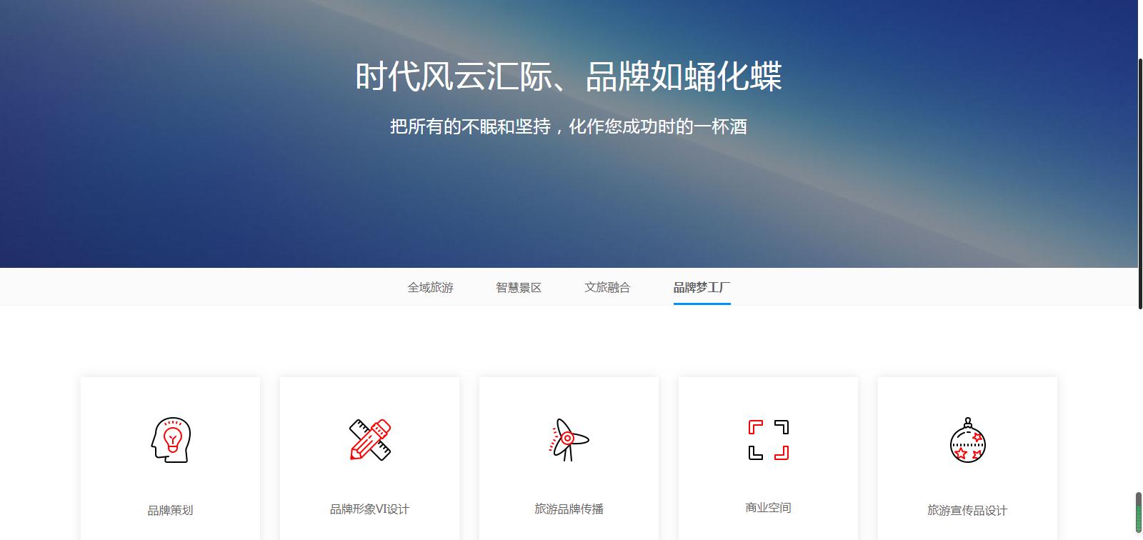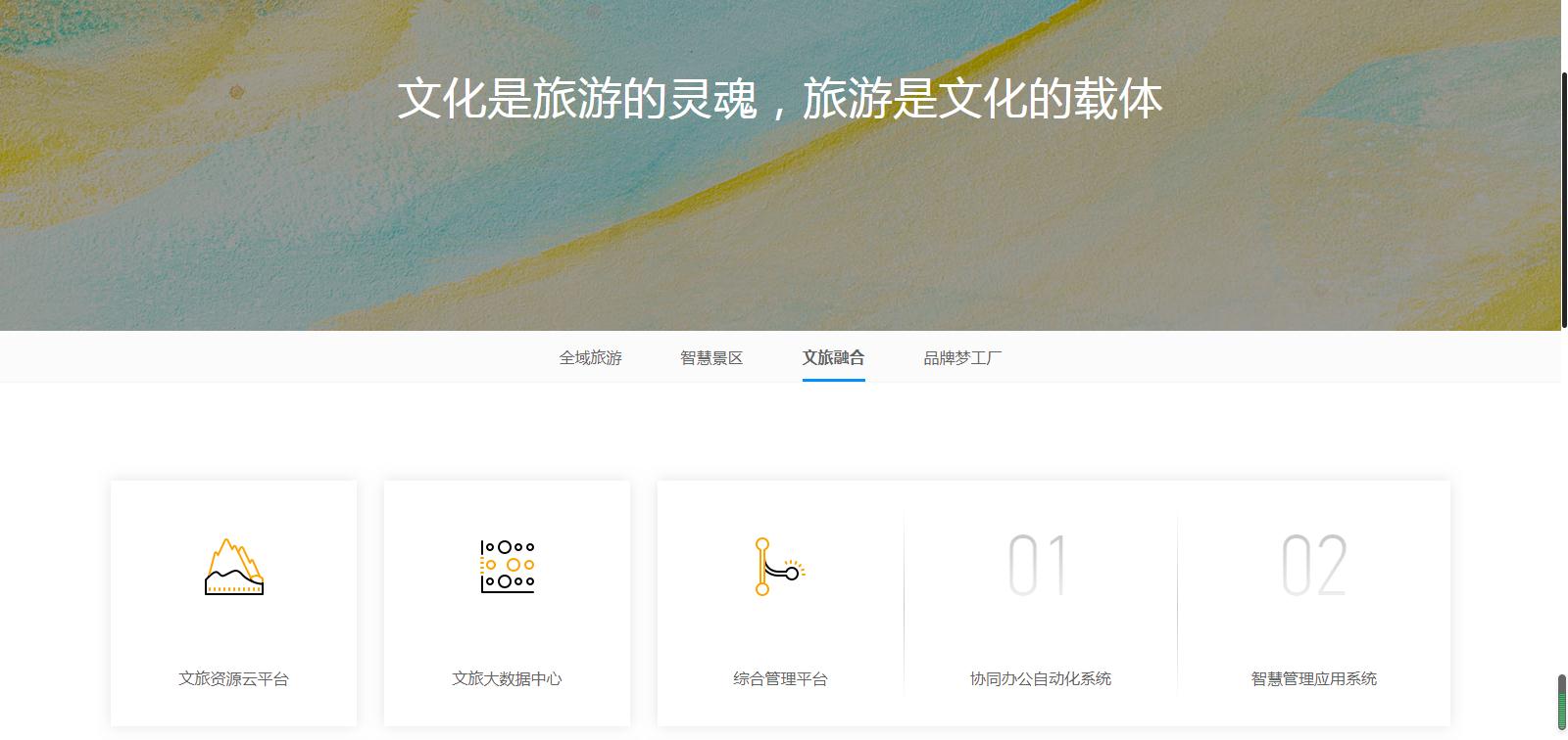 該產品模塊主要分為全域旅游、智慧景區、文旅融合、品牌夢工廠四大模塊,從硬件軟件到系統開發,從文案策劃到設計創新,所有產品一應俱全,分類清晰,方便客戶針對自身需求尋找對應的產品。