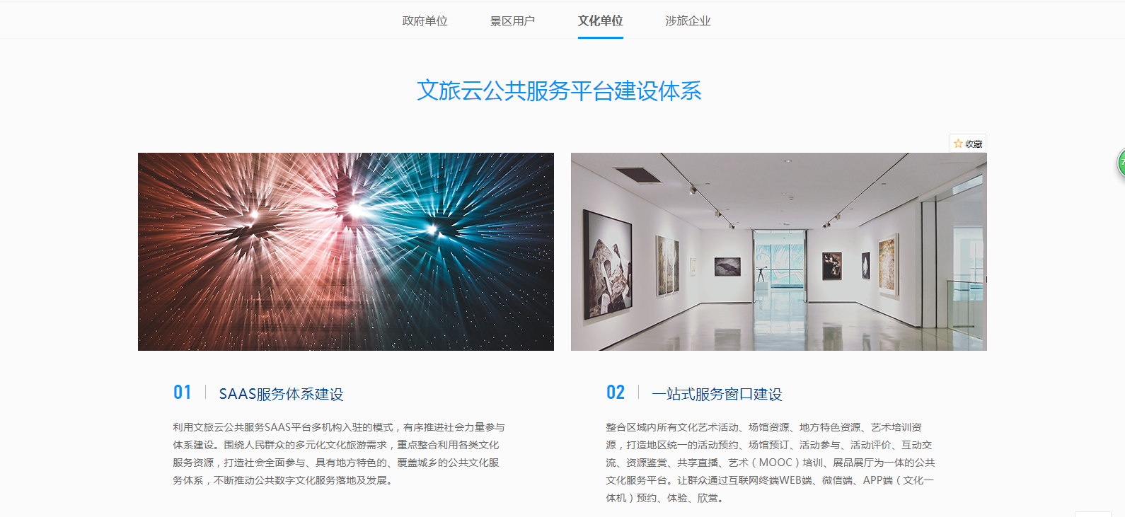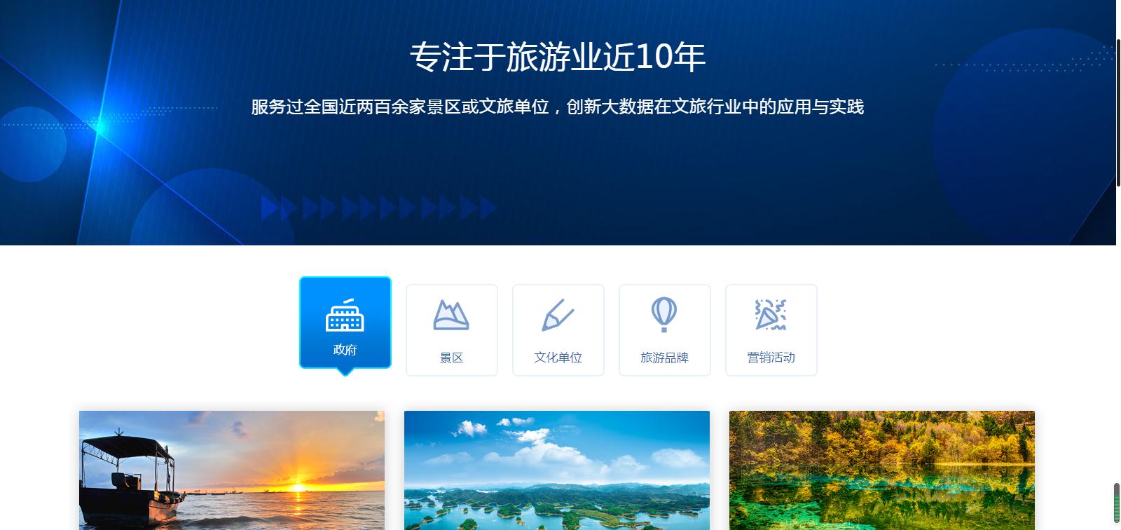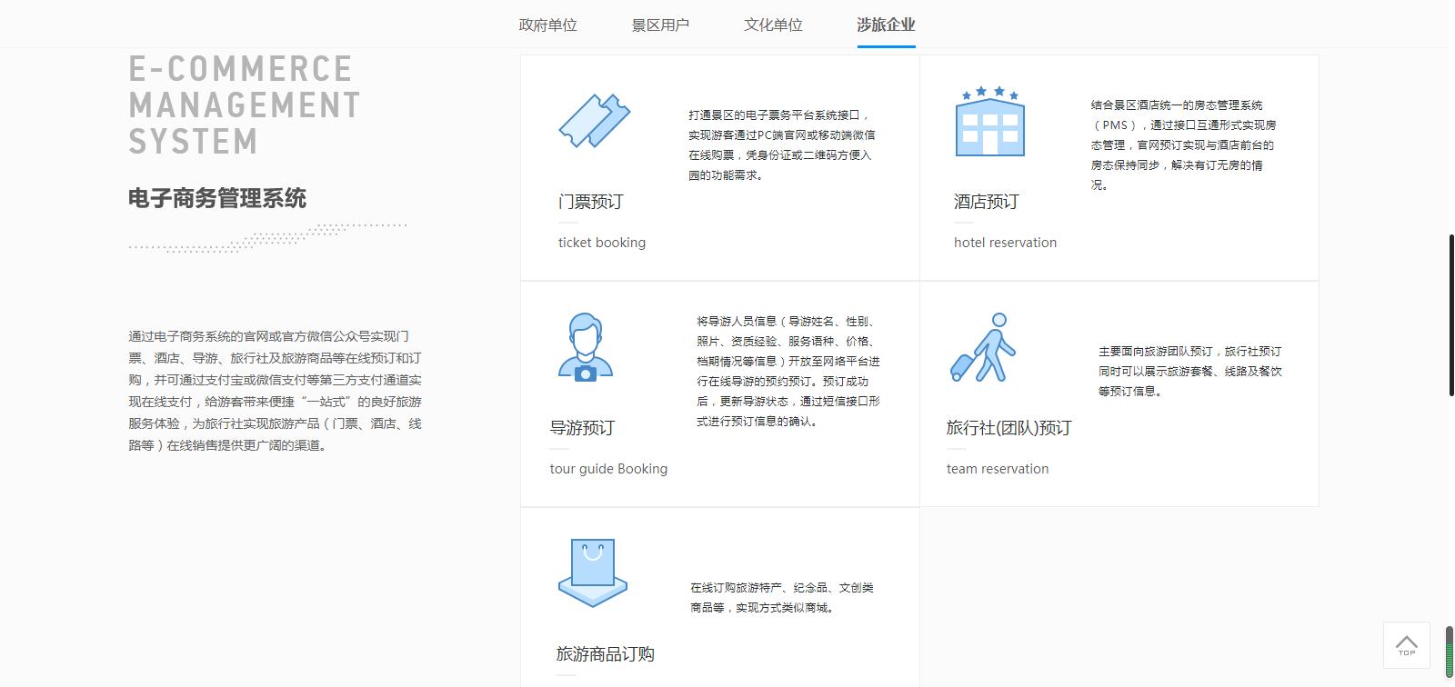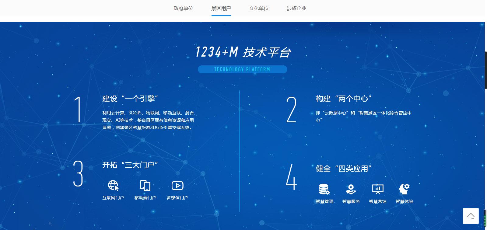針對不同用戶屬性,分為政府單位、景區用戶、文化單位、涉旅企業。為不同行業客戶及合作伙伴,提供更為詳盡的方案支持,如政府單位的全域旅游“121工程”、景區用戶的“1234 M”技術、文化單位的服務平臺建設體系、涉旅企業的電子商務系統和活動營銷平臺。